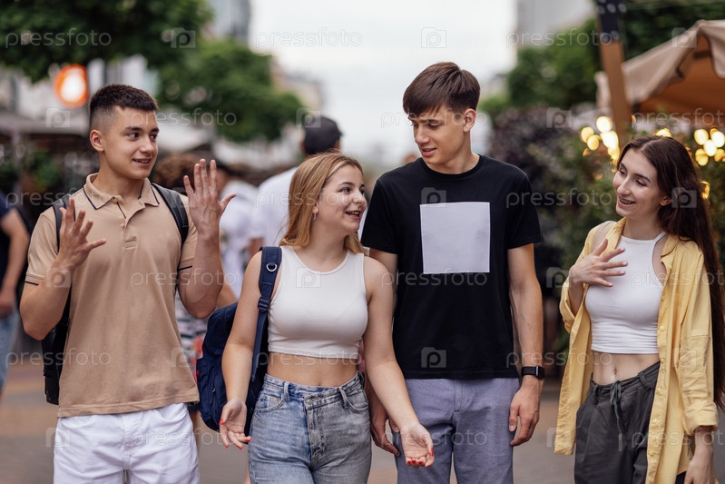 Четверо друзей в повседневной одежде гуляют по городу