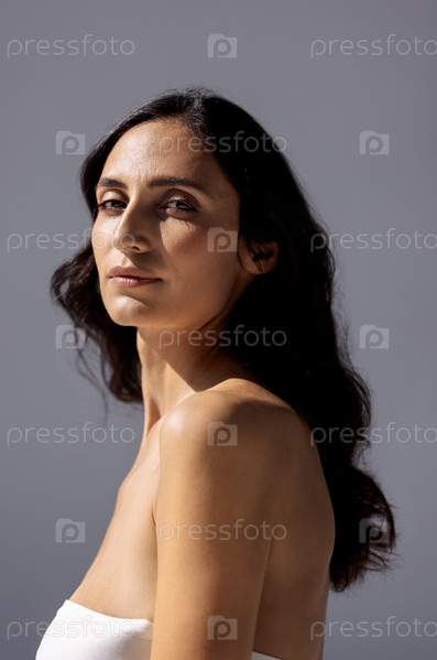 Студийный портрет привлекательной молодой женщины на сером фоне