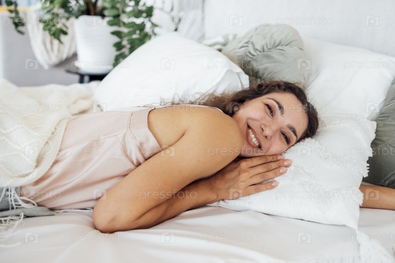Привлекательная счастливая молодая женщина лежит в постели с закрытыми глазами