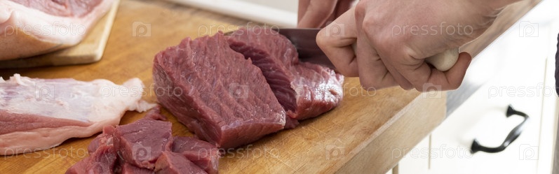Мужские руки режут свежее сырое мясо на борту на белой кухне. Подготовка мяса свинины, варка. баннер
