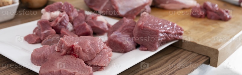 Крупным планом горошины мяса, нарезка свежего сырого мяса на борту белой кухни. Подготовка свинины, варка. Баннер