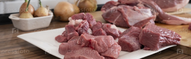 Горох мяса, нарезка свежего сырого мяса на борту белой кухни. Баннер, подготовка свинины, приготовление пищи