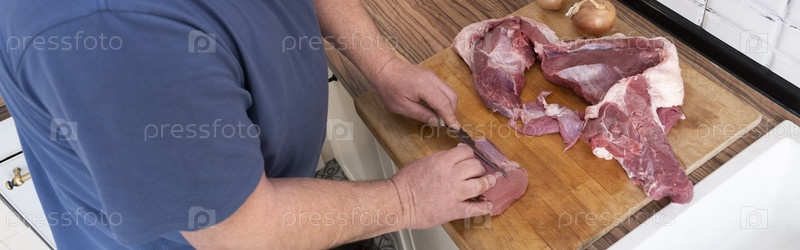Настоящие мужчины режут свежее сырое мясо на борту белой кухни. Подготовка свинины, приготовление пищи, баннер