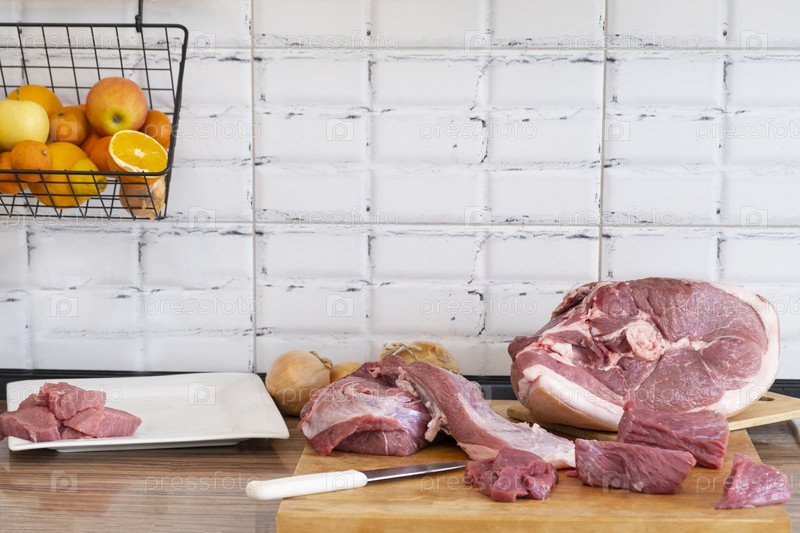 Различные виды мяса, нарезка сырого мяса на кухне. Готовка. Копировать пространство