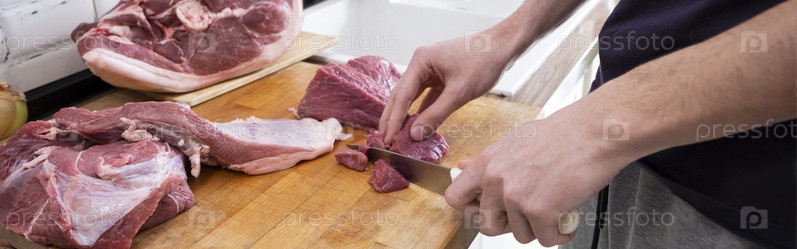 Настоящие мужчины режут свежее сырое мясо на борту белой кухни. Подготовка свинины, варка. Баннер