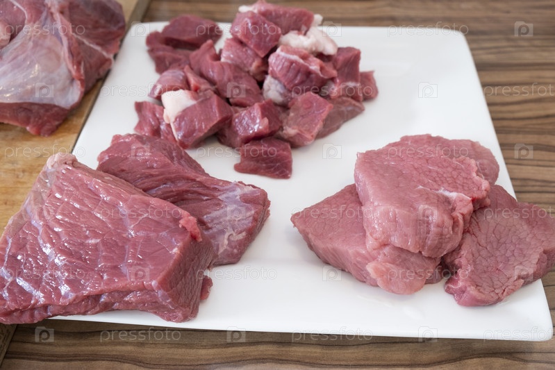 Различные виды мяса, нарезка свежего сырого мяса на борту белой кухни. Подготовка мяса свинины, варка