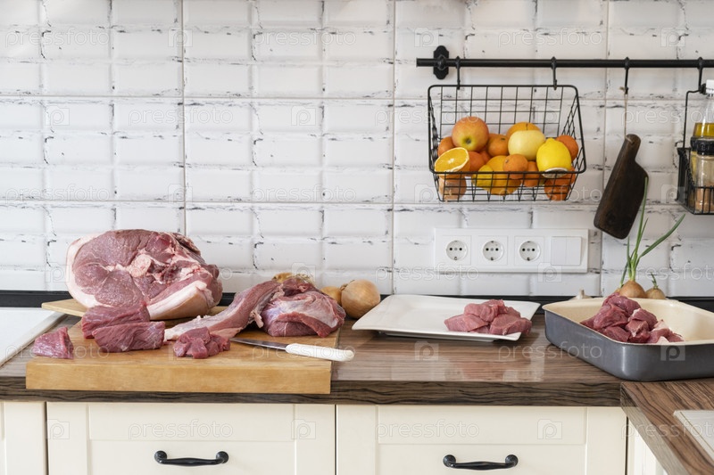 Разные виды мяса. Баннер, разрезающий свежее сырое мясо на борту на белой кухне. Подготовка мяса свинины, варка
