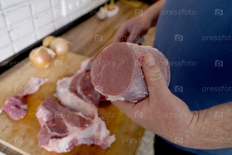 Настоящие мужчины режут свежее сырое мясо на борту белой кухни. Подготовка мяса свинины, варка