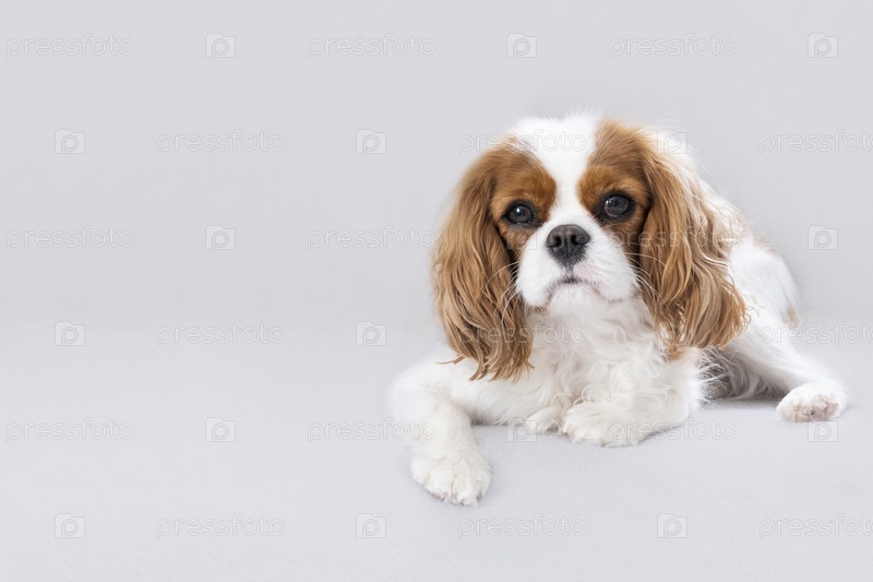 Портрет милого щенка. Лицо собаки на сером фоне. Копировать пространство