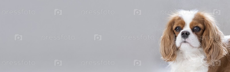 Портрет милого щенка кавалера. Баннер, собака на сером фоне. Копировать пространство