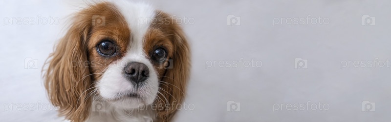 Портрет милого щенка кавалера. Баннер, собака на сером фоне. Копировать пространство