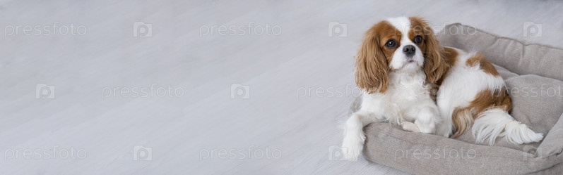 Портрет милого щенка кавалера. Баннер, собака на сером фоне. Копировать пространство