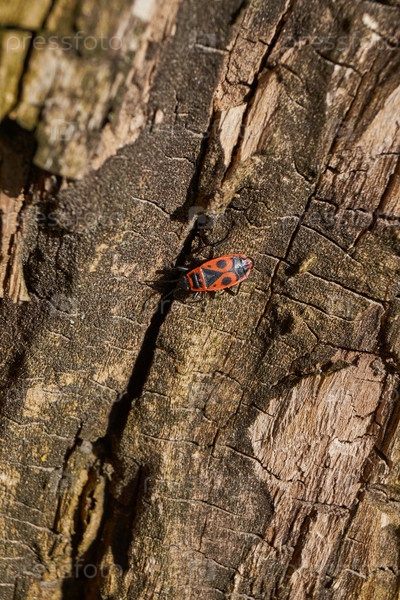 Клоп-солдат ползет по стволу старого гниющего дерева. Весна