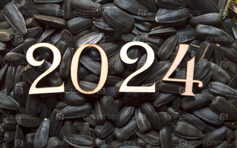 Новый год 2024. Цифры на фоне черных семечек. Деревянные цифры