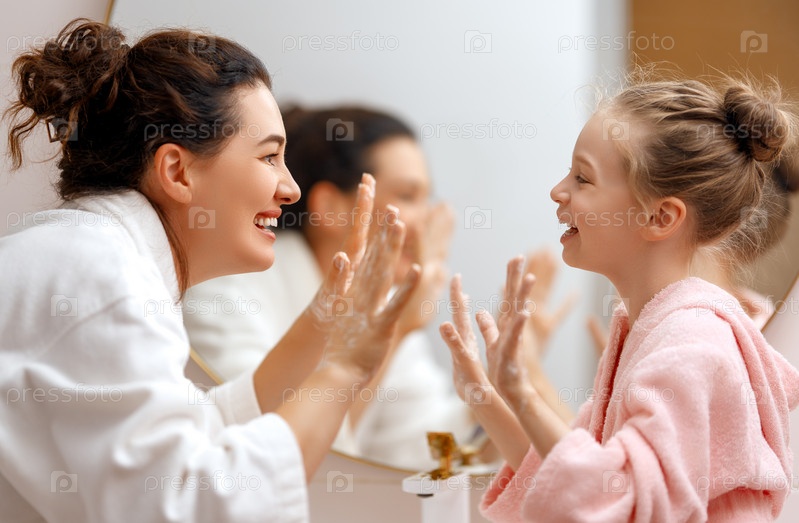 Девочка и ее мама моют руки