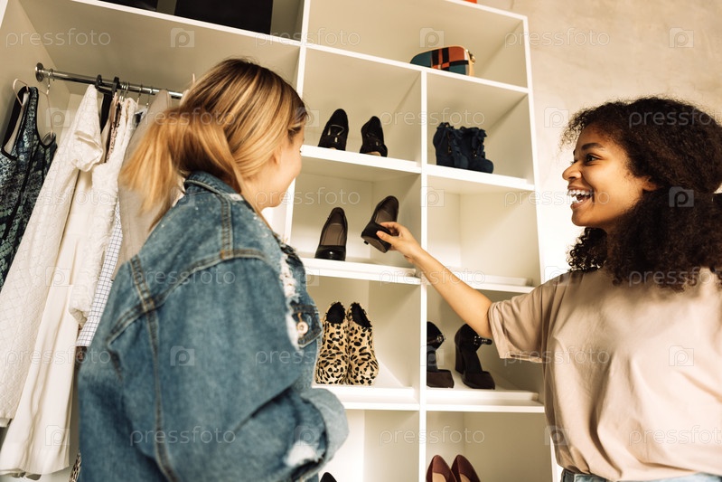 Очаровательные девочки-подростки разных рас покупают в магазине обувь и одежду. Счастливая африканка показывает подруге туфли, которые она выбрала. Симпатичные студенты вместе ходят по магазинам и веселятся
