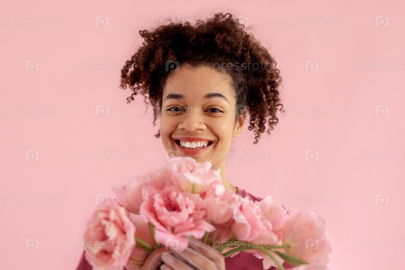 Красивая африканская девушка держит возле лица букет розовых цветов