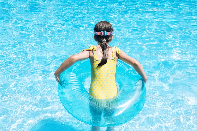 Маленькая девочка с надувным кругом прыгнула в бассейн. Милый ребенок в купальнике