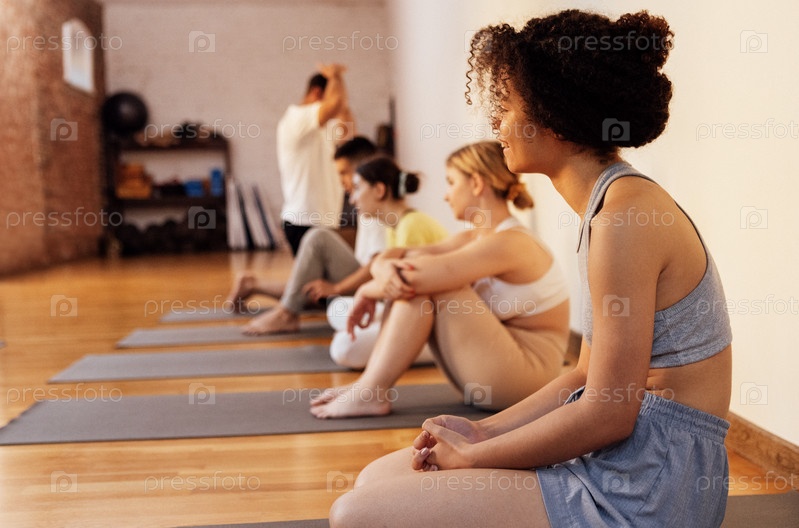 Группа многонациональных спортсменов сидит на ковриках после занятий йогой и болтает