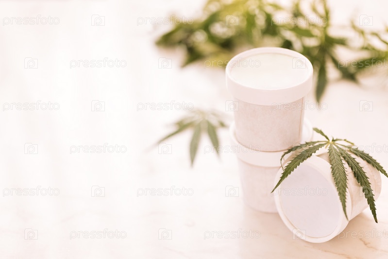 Лист конопли лежит на макетных банках с мороженым на белом мраморном столе