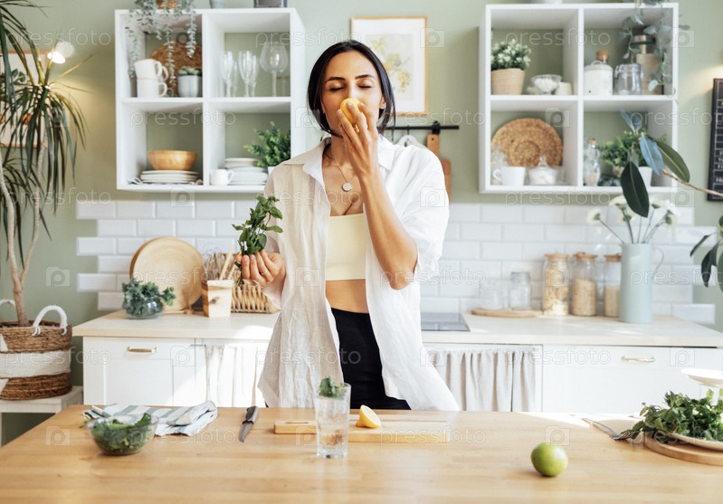 Молодая привлекательная женщина готовит вкусный свежий лимонад и нюхает лимон и мяту