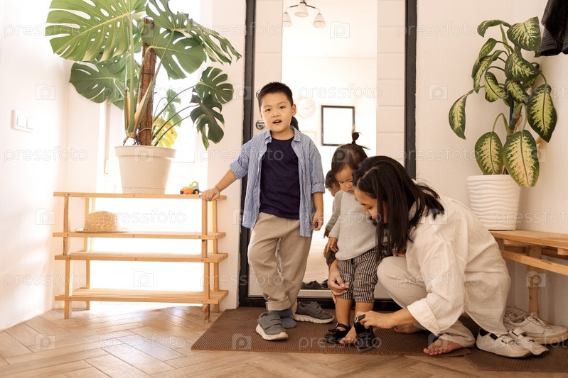 Счастливая азиатская семья. Молодая привлекательная женщина помогает снять обувь своей маленькой дочери