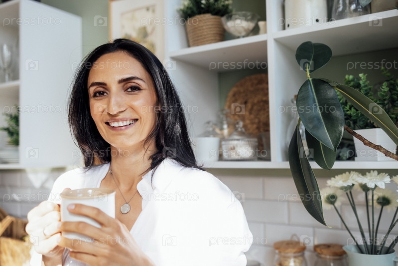 Очаровательная молодая женщина стоит на залитой солнцем кухне и держит белую кружку