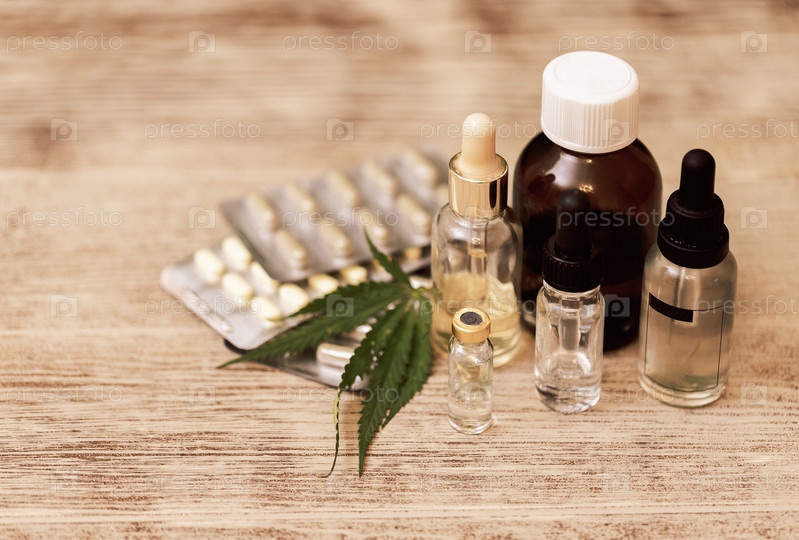 Макеты лекарств на бежевом фоне с листьями конопли. Макеты флакона с лекарством, белого пустого распылителя и таблеток на мраморном столе с зелеными листьями конопли
