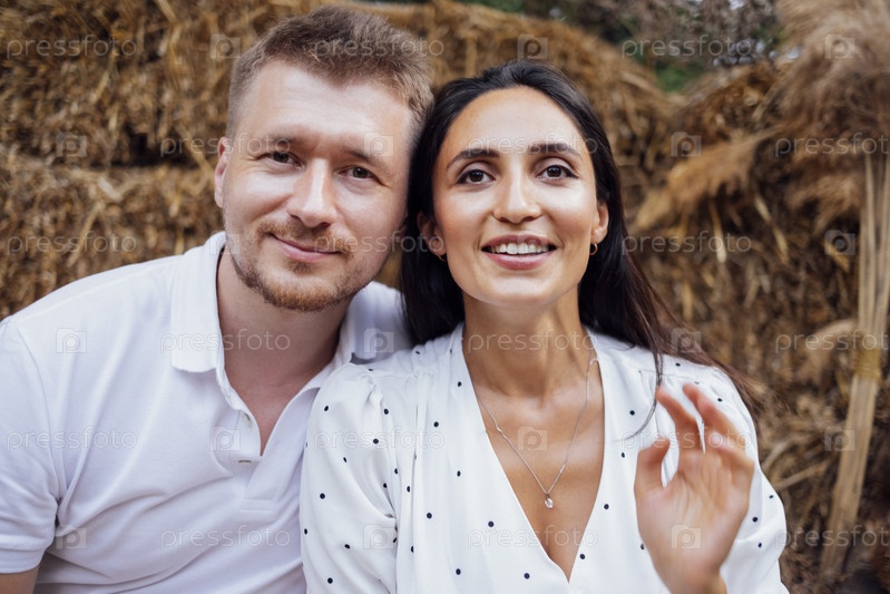 Портрет молодой улыбающейся влюбленной пары на фоне сада или природы