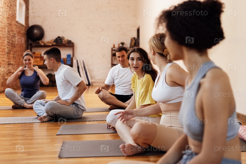 Группа многонациональных спортсменов сидит на ковриках после занятий йогой и болтает. Окончание занятий фитнесом и непринужденные разговоры людей в спортивной одежде в спортзале