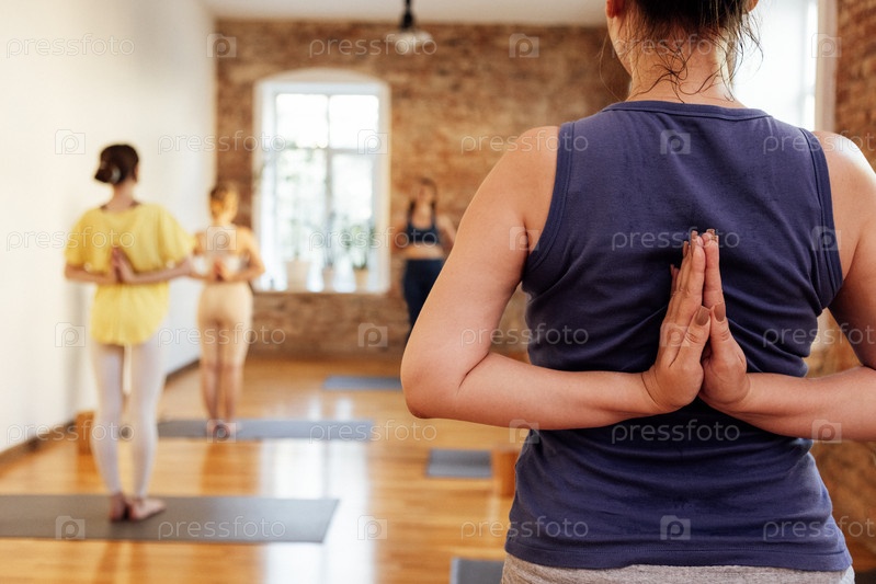 Крупный план женщины, практикующей йогу в фитнес-клубе. Руки в жесте намасте. Группа молодых женщин на занятиях йогой в позе Пашим Намаскарасан