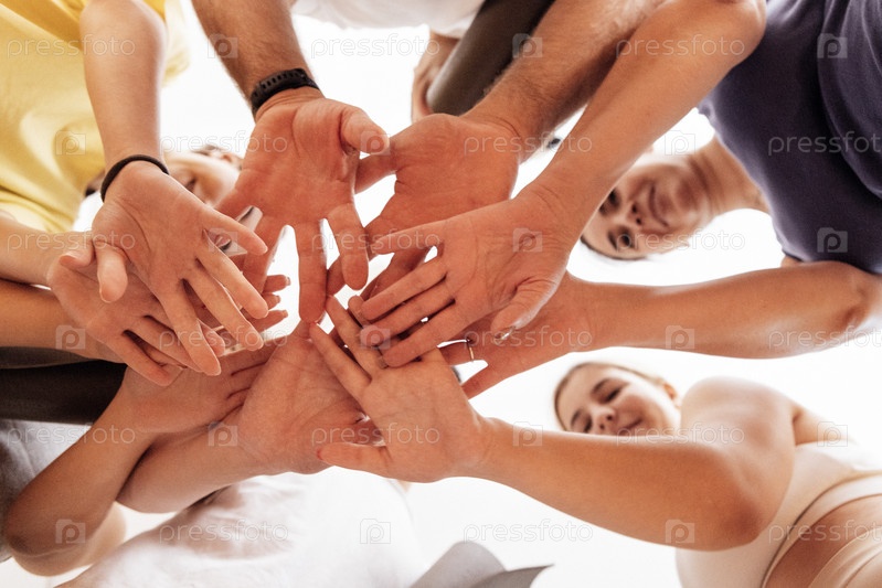 Молодые улыбающиеся люди в спортивной одежде складывают руки на светлом фоне. Женщины и мужчины стоят в кругу и держатся за руки