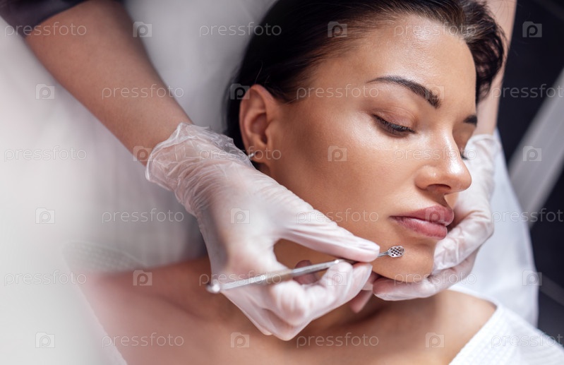 Профессиональный косметолог очищает женщину от прыщей во время процедуры против старения