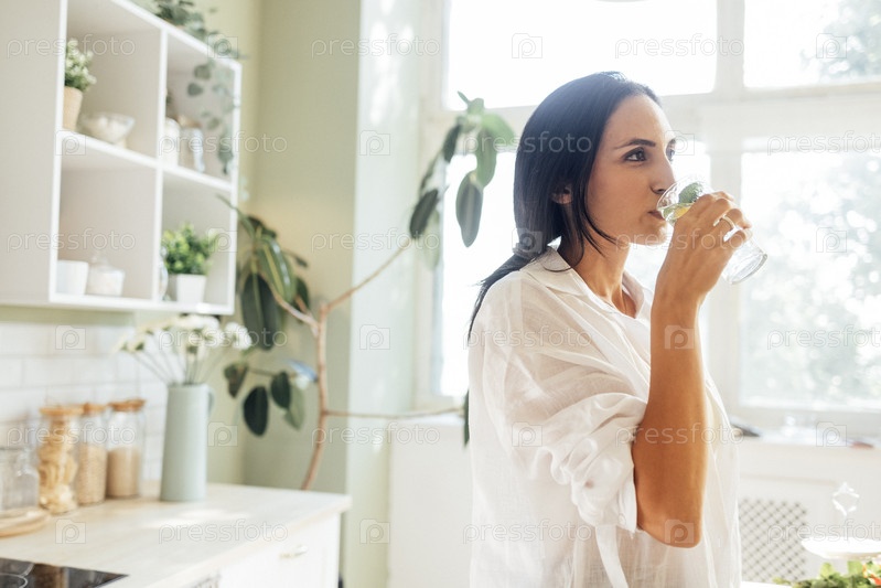 Привлекательная молодая женщина пьет свежий вкусный домашний лимонад на кухне