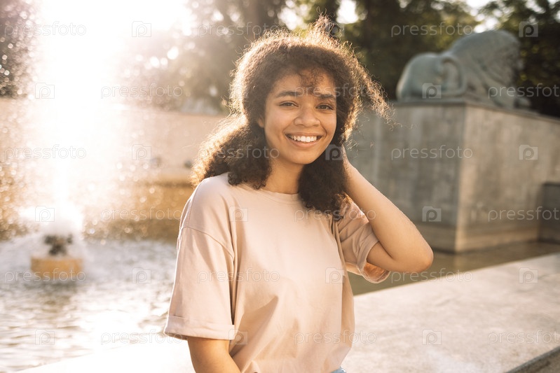 Молодая очаровательная афроамериканка в бежевой футболке смеется на улице