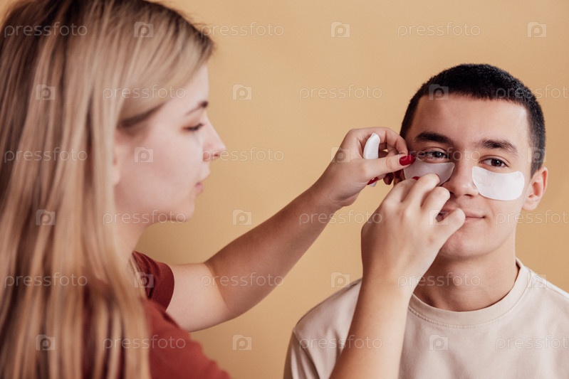 Симпатичная блондинка прикрепляет увлажняющие патчи под глаза подруги. Симпатичные подростки заботятся о коже лица. Косметическая процедура. Рутина красоты