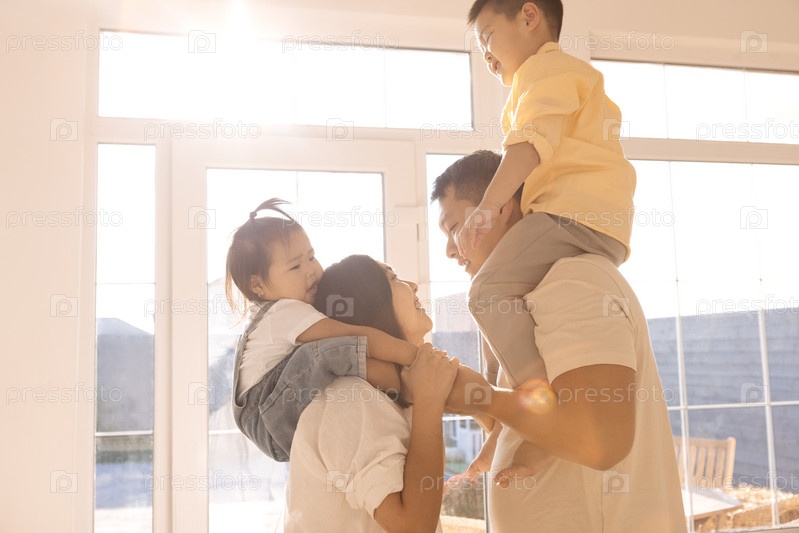 Молодые корейские родители держат своих милых маленьких детей