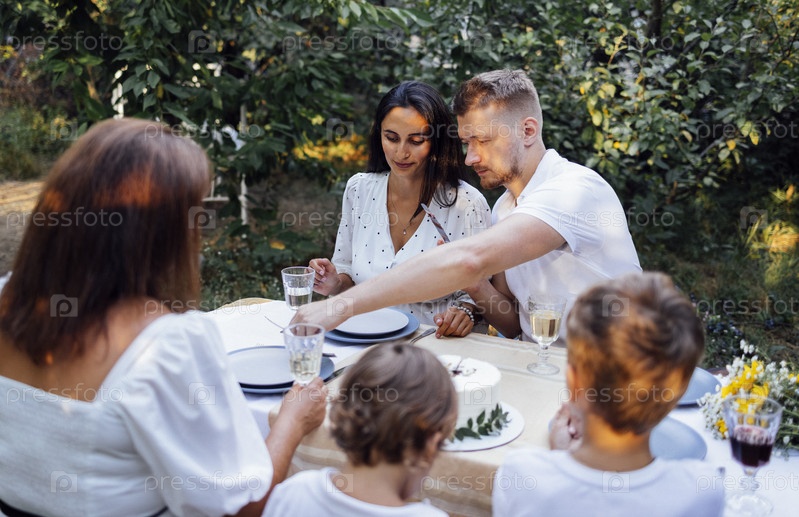 Счастливая кавказская семья обедает за столом на улице. Мама, папа, двое сыновей находятся на открытой веранде дома или в открытом кафе