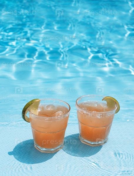Два стакана с вкусным коктейлем с кубиками льда. Вкусный свежий напиток с ломтиками лайма у бассейна. Солнечный день и отражение лучей в голубой воде на заднем плане. Отдых в отеле