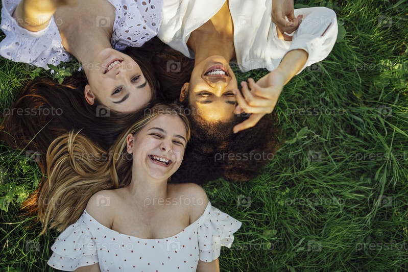 Три милые девушки-подростки разных национальностей в белых элегантных платьях сидят на траве