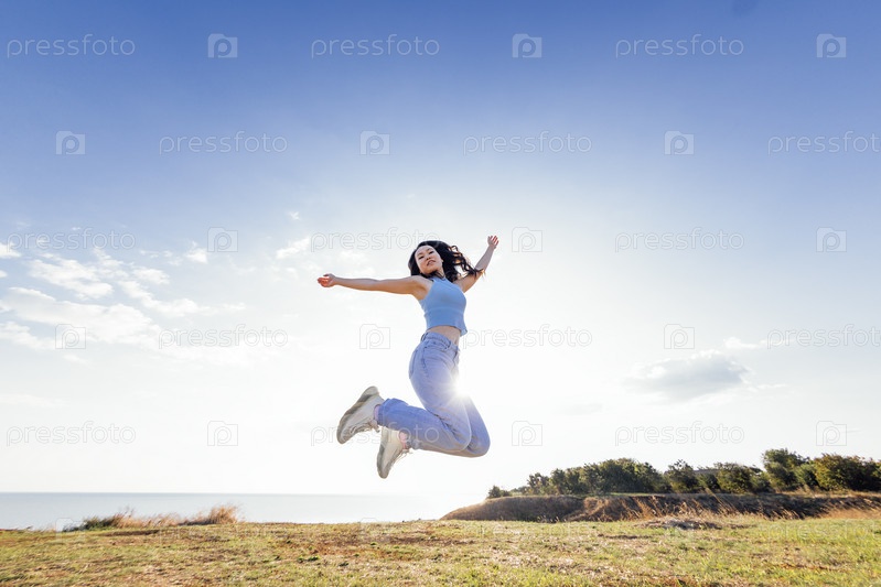 Очаровательная азиатка с длинными волнистыми волосами в повседневной одежде прыгает и смеется на улице. Молодая жизнерадостная кореянка развлекается на природе