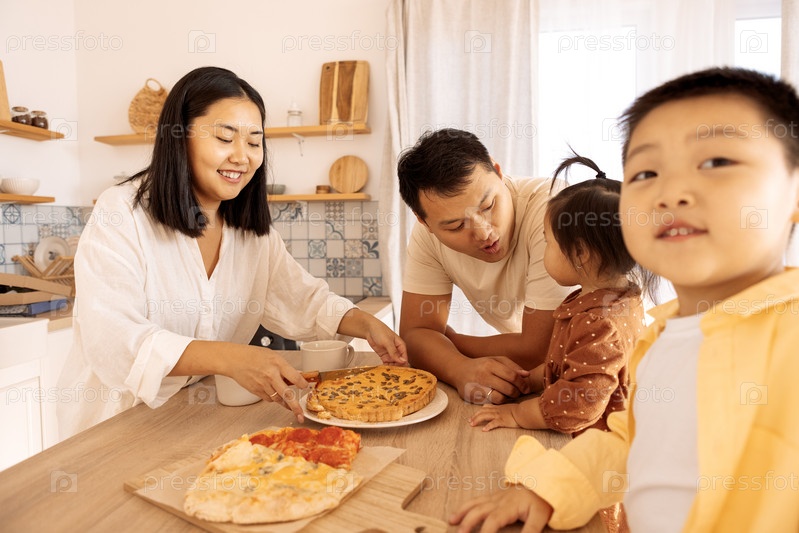 Счастливая азиатская семья ест пиццу на кухне дома