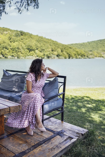 Романтический портрет красивой женщины в солнцезащитных очках и длинном розовом платье в горошек, сидящей на скамейке с подушками и смотрящей на пейзаж