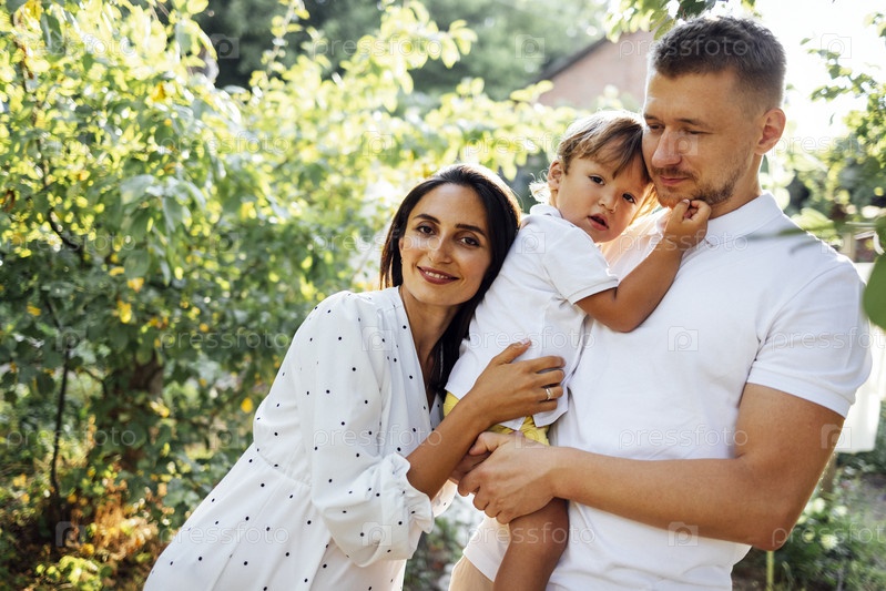Молодая пара и их сын на улице в солнечный летний день