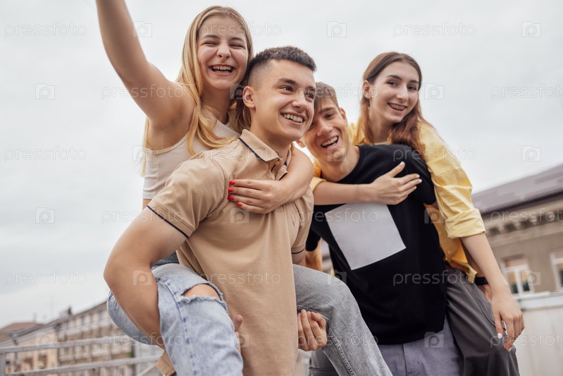 Симпатичные девушки в повседневной одежде катаются на спинах красивых парней по крыше дома