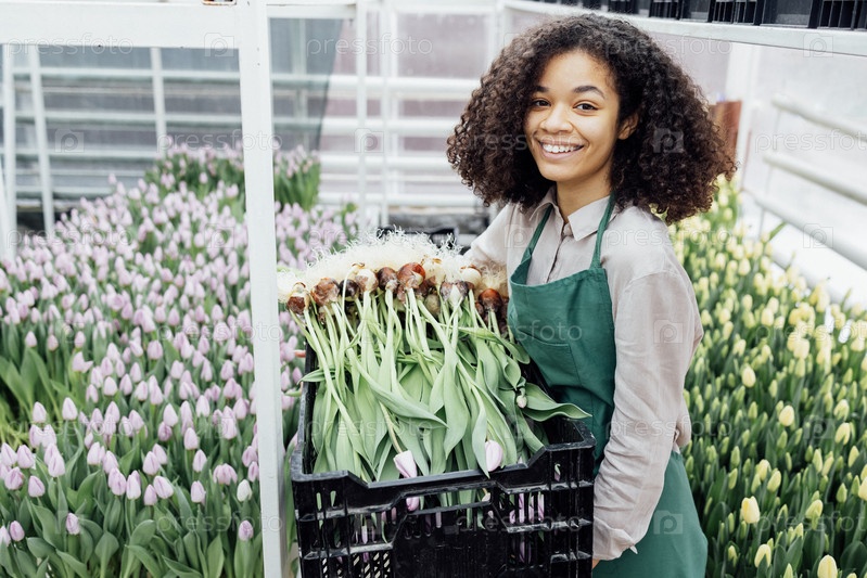 Молодая улыбающаяся африканская женщина в повседневной одежде и зеленом фартуке держит коробку с саженцами тюльпанов на фоне ярких цветов в теплице
