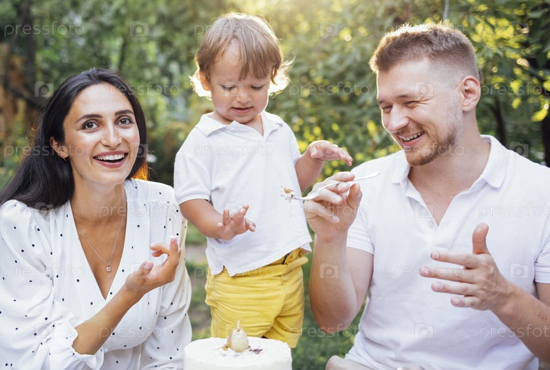 Маленький милый ребенок и его родители дегустируют праздничный торт на открытом воздухе в саду. Счастливая семья веселится