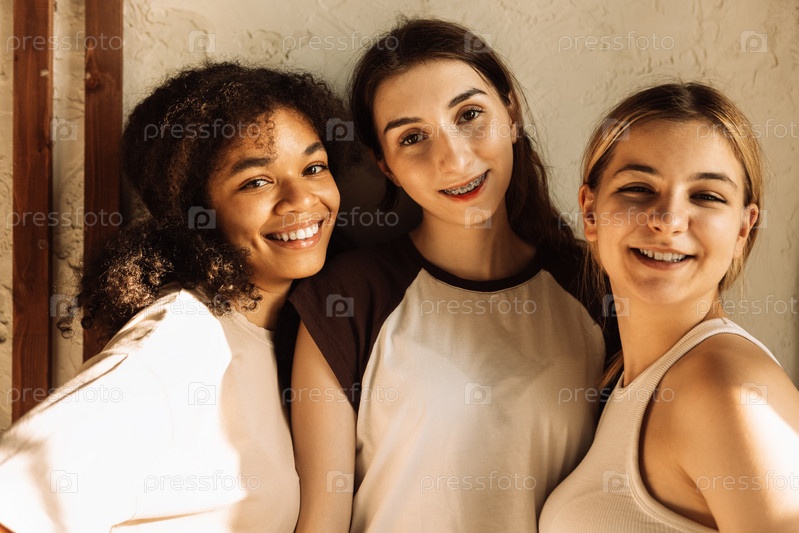 Счастливые милые девушки разных рас смеются и болтают