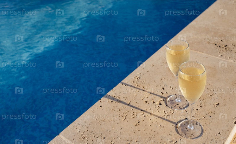 Крутые бокалы шампанского у бассейна в курортном отеле во время отпуска или выходных