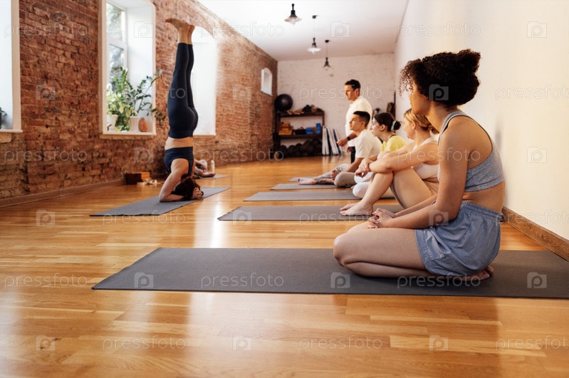 Тренер показывает своим ученикам стойку на голове. Группа людей разного возраста и национальности занимается йогой в фитнес-клубе. Молодые здоровые женщины и мужчины сидят на циновках